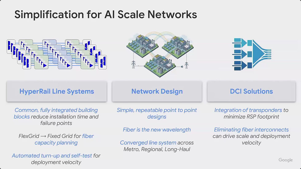 架構極簡化:為了提升佈署速度,Google 正減少對 ROADM 與 FlexGrid 技術的依賴,轉向更簡單的點對點(Point-to-point)設計 。
