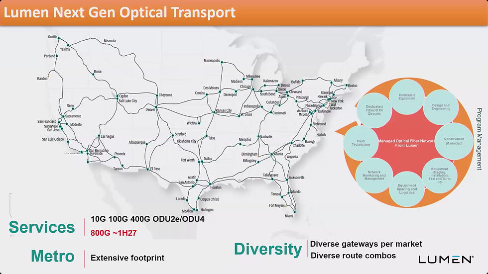 光纖資產擴張:Lumen 目前擁有 1,700 萬英里光纖,並計畫在未來 3-5 年內透過與 Corning 的合作再增加 4,100 萬英里 。